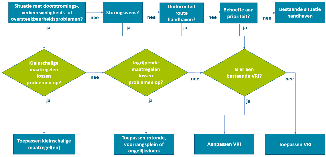 Dit afwegingsproces om te komen tot oplossingen voor problemen met de doorstroming, verkeersveiligheid of oversteekbaarheid bij bestaande kruispunten, is samengevat weergegeven in Figuur 1.