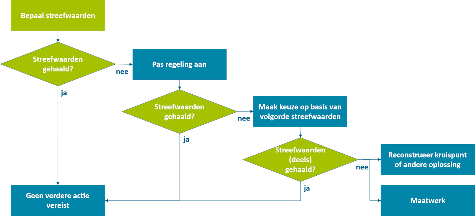 In de praktijk blijkt dat niet altijd wordt voldaan aan de streefwaarden voor alle categorieën op een kruispunt. Dit speelt vooral als meerdere belangrijke categorieën op een kruispunt samenkomen. Voor die situaties is het goed een uniforme werkwijze aan te houden, gericht op die situaties waar extra inspanning nodig is om te proberen streefwaarden te halen. Deze werkwijze is schematisch weergegeven in Figuur 3.